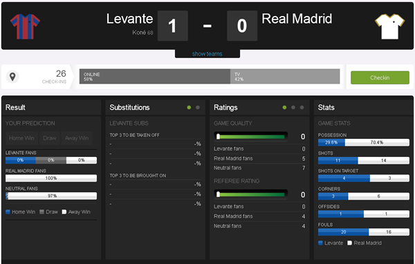 Se hace check-in en los partidos que queremos seguir. Todo lo que hacemos los seguidores de ese partido aparece en un muro común, opiniones, check-ins, votaciones, nuevos amigos, etc. Es una forma de seguir un partido muy diferente que permite ver y comentar a tiempo real con amigos y otros usuarios desconocidos, incluso seguidores del equipo rival.