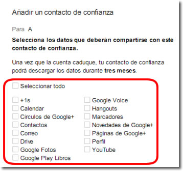 Donde elegimos un máximo de diez contactos de confianza a los que se les proporcionarán nuestros datos y el contenido concreto de nuestra cuenta que queremos ceder.