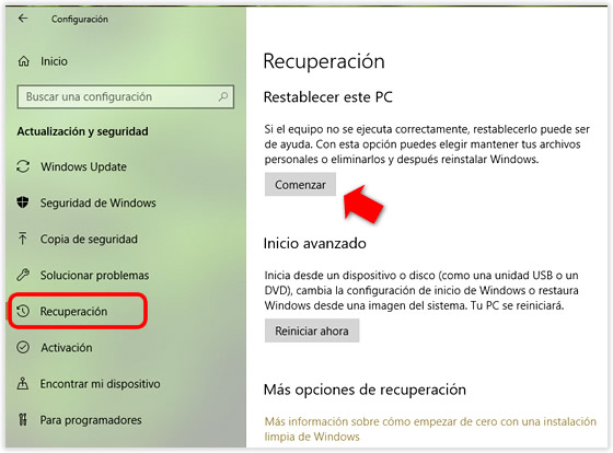 Si en el futuro tenemos problemas de funcionamiento o simplemente queremos volver a tener el ordenador exactamente igual que el día en que hicimos la copia de la imagen, solo deberemos conectar el disco duro externo e ir a Configuración > Actualización y seguridad > Recuperación y pulsar en Comenzar.