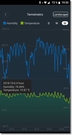 Toda la información queda registrada y se puede consultar en cualquier momento. En el caso de la temperatura y la humedad podemos ver los datos en gráficas.
